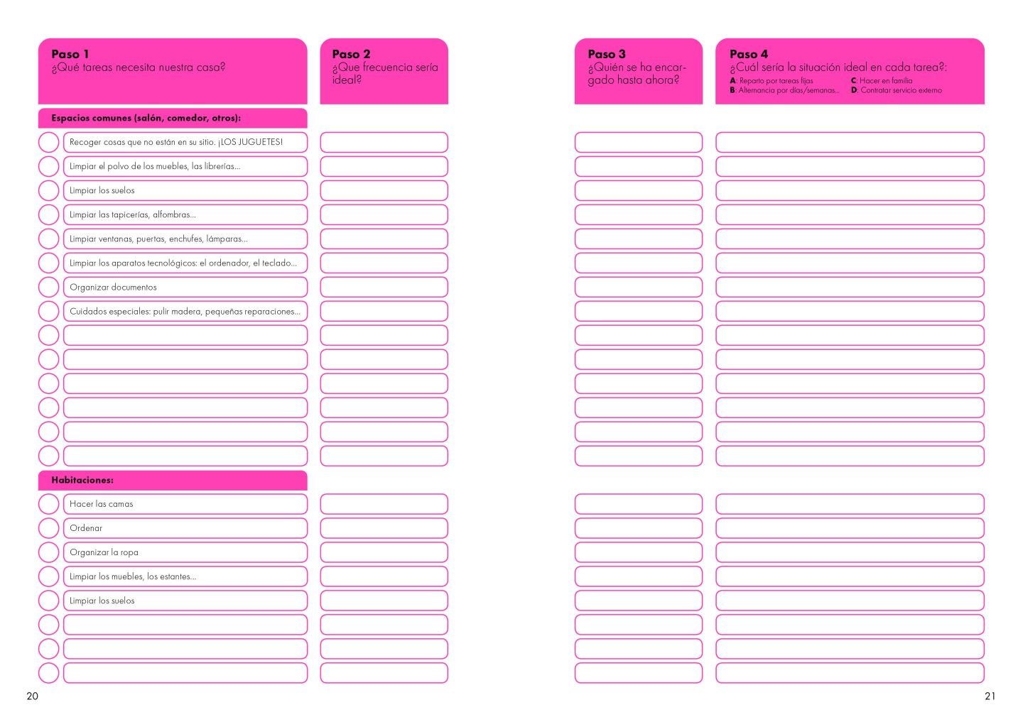 We’re convinced that if we value, share equitably and regularly perform our household chores, the whole family enjoys life and their home equally. Easy, logical. You’ll find tables and explanations, tips and tricks to make everything work, to make things easier, to avoid arguments...