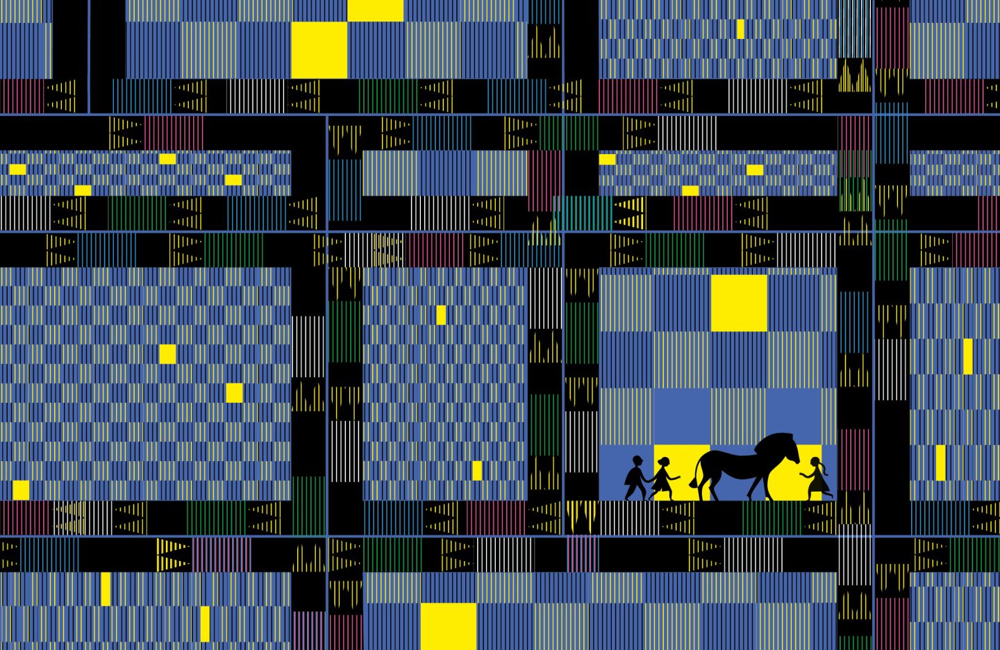 The pages of our book come alive with a type of shadow theater, ombro-cinema. By running a special striped film across the pages, we see the movement of city streets, the flickering of traffic lights, the tricks of acrobats, the fluttering of butterflies, and even the secret life of works of art.